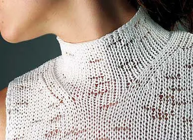 9. Довязав до высокой точки плеча, ввести сначала в работу иглы левого плеча, закрыть их нестягивающим способом. Провязать 1 ряд, далее закрыть петли правого плеча.