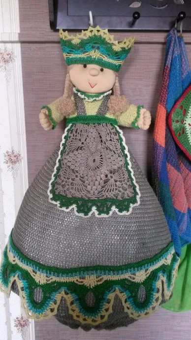 Для контейнера использовала покупную мордочку - кажется, это была прихватка с личиком. Поэтому не могу описать, как сделать голову для куклы-пакетницы. Думаю, на просторах интернета найдете соответствующую инструкцию или, как и я, купите что-то подходящее. Косички сделала из ниток х/б, кокошник связала и накрахмалила в водяном растворе ПВА, платье смастерила, как для обычной куклы, только юбку надо сделать особо длинную и широкую; по краю подола - ввязать любой эластичный прут (в магазине стройматериалов поищите), от него связать еще немного и в конце вязания продеть резику - примерьте, чтобы влезала рука и можно было класть и вынимать пакеты, но чтобы они сами не вываливались.