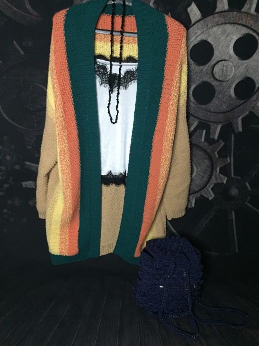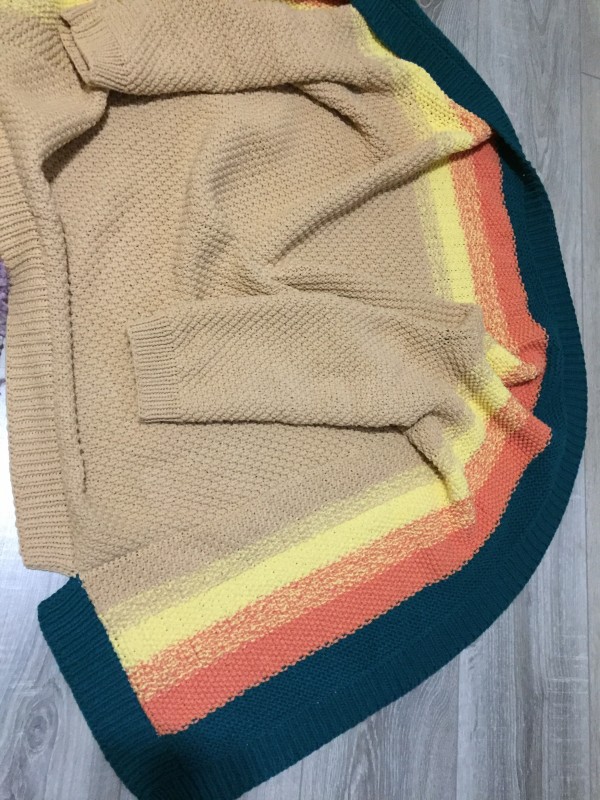 А выкройки нет. Интуитивно))) там-тут подсмотрела идею. По переходам цвета поняла, что вяжется одним полотном и складывается. Вяжется буквой Т. Рукава отдельно.