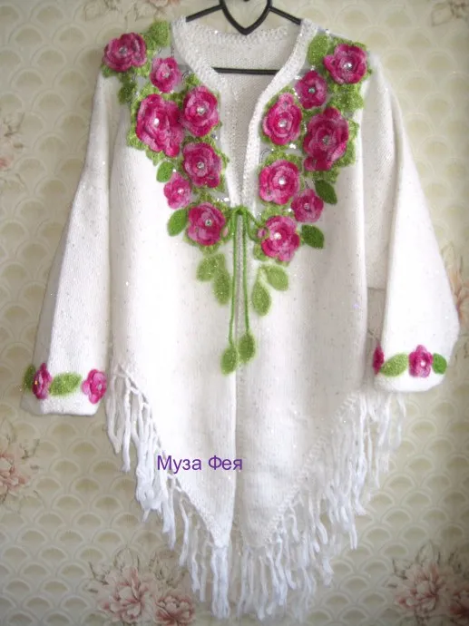 Пончо связано в две нити: турецкая пряжа с пайетками+ одна нить тонкого мохера Голд от Камтекс. Розы и листья - из секционной х/б пряжи и акрила с люрексом. Они нашиты на сетчатую ткань с пайетками.