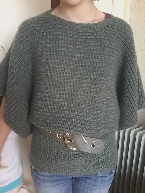 Понравился мне вот этот джемпер, но схемы нет. Сложностей тоже нет. Вяжется от рукава одним полотном на высоту 25 см, затем с обеих сторон нужно добавить петли на нижнюю часть. У меня 42 размер, через 40 см эти же петли закрываем и снова вяжем только рукав 25 см. Для горловины закрыла на спине 2 раза по 1 петле, на передней части - 6 раз по 1 петле