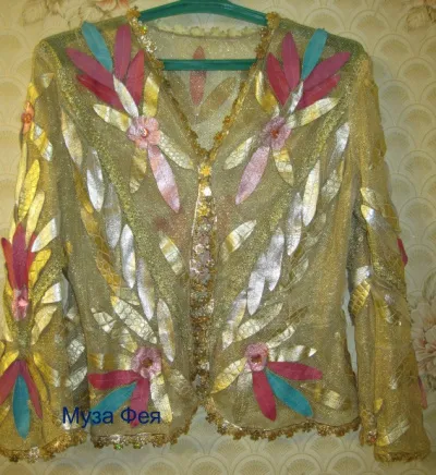 Нарядный жакет сшит из сетчатой ткани и расшит листочками (пёрышками) из тонкой натуральной кожи. Сначала скроить детали по своей выкройке, наметать, примерить, посадить. Снять наметку. Затем разложить и приколоть на детали перышки, вырезанные по шаблону. Можно использовать кусочки кожи.