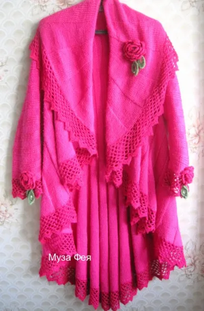 Накидка связана спицами из п/ш отечественной пряжи и полутора мотка турецкого акрила с люрексом для сетки и роз. Немного зеленой пряжи для листиков и стразы.