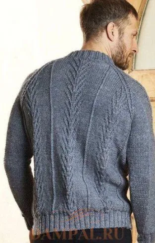 Мужской джемпер с рукавом реглан связан ненавязчивым рисунком и имеет застёжку на горловине.