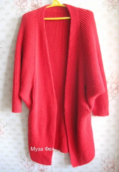 Кардиган связан резинкой 1х1 (классической) из п/ш пряжи "Мерино спорт", 50% шерсти, 50% - полиакрила. Расход - 400г. Фасон без описания, скопирован мной с готового белого кардигана. У него очень красивый и стильный дизайн, элегантные и необычные линии. При надевании перед получается немного длиннее спинки, полки расходятся изящными уголками.