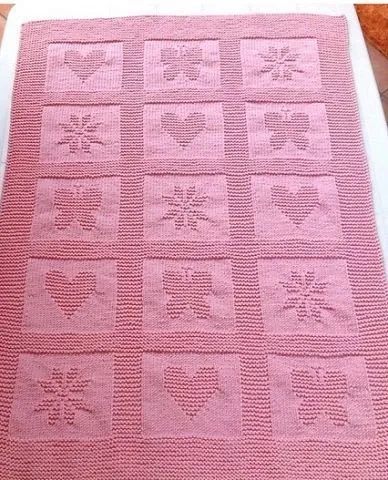 Детский плед из квадратных мотивов, связан спицами изнаночными и лицевыми петлями