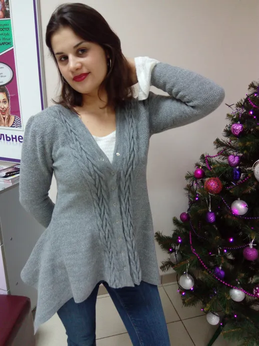 Кофта связана из полушерстяной пряжи, мягкая и практичная вещь. Это изделие можно носить как повседневную одежду, а так же и на выход. Спереди кофту или кардиган украшают широкие косы, подол неровный, по бокам свисающий клиньями, рукав длинный, без воротника, застёгивается на кнопки. Вязка мелким рисунком. В этом кардигане будет уютно и зимой и прохладными летними вечерами. Такое изделие можно связать из пряжи другого цвета, или из более дорогого материала, например, из козьего пуха (указанная пряжа сильно не пушится).