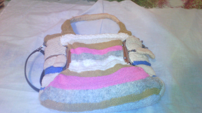 Это сумка обвязанная спицами разными нитками лицевой гладью.