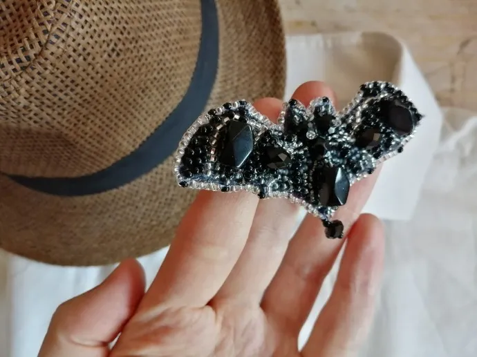 Вместо 1 оттенка чёрного я использовала 3, вышивка получилась многослойной. Поверх базового слоя я вышила "горки", чтобы сделать брошь объёмной. Прожилки в крыльях и край обшиты серебряным бисером, на самом тельце присутствуют камни чёрного агата и стеклянные граненные камушки.
