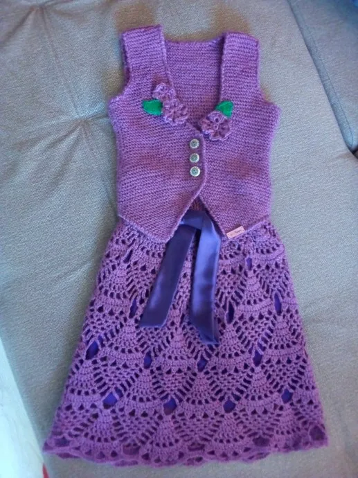 Красивый костюмчик, цвет приятный! Хорошо владеете крючком и спицами ))