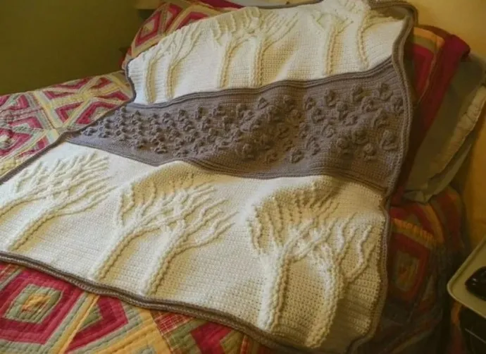 Плед конечно же крючком. Дерево классно вообще смотрится выпуклым по глади. В спицах — лицевые по изнанке, в крючке выпуклыми столбиками по обычным. Супер! Утащила, спасибо!
