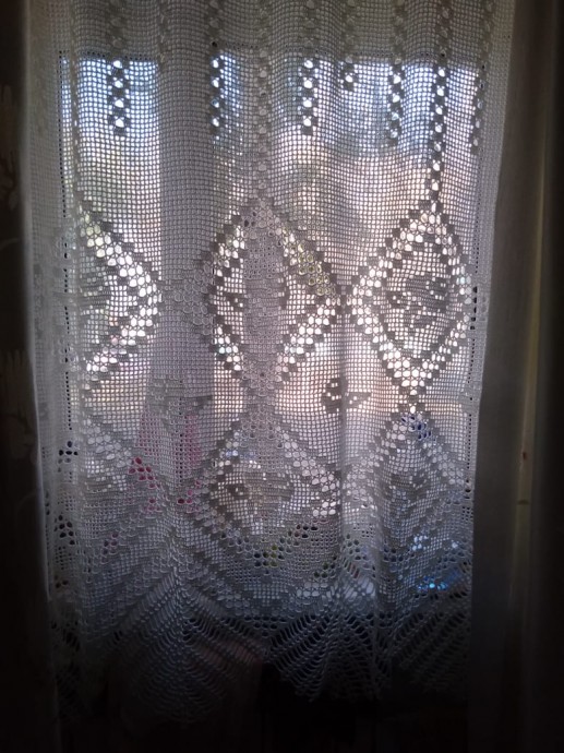 Добрый день волшебницы! Давненько меня не было на сайте,а у Вас здесь столько всего красивого и интересного появилось! Я тоже не с пустыми руками)) Зачесались ручки и решила воплотить давнюю свою мечту. В итоге связалась у меня вот такая штора. Первые фото сделаны в комнате чтобы видно было всю штору,а последние, она висит уже на месте - на кухне))