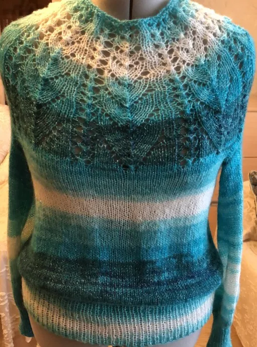 Пряжа Alise angora gold simli 500 м / 100 г. Расход на размер 44 — 160 г. Спицы №№ 3,5; 4,5.