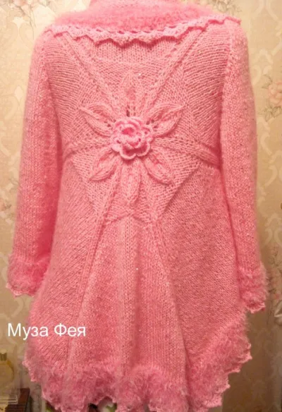 Модель моя, связана из турецкой пряжи Alize Sal Abiye с пайетками + тонкий мохер "Камтекс". Отделка по периметру и на рукавах - несколько рядов пряжей "Лебяжий пух", затем -зубчики крючком из основной пряжи.