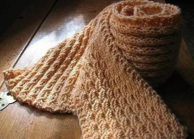 13-й ряд - * 2 изнаночные, 5 петель перекрестите налево (2 петли переснимите на вспомогательную спицу и оставьте перед работой, 3 лицевые, затем провяжите лицевыми петли с вспомогательной спицы),* 2 изнаночные.