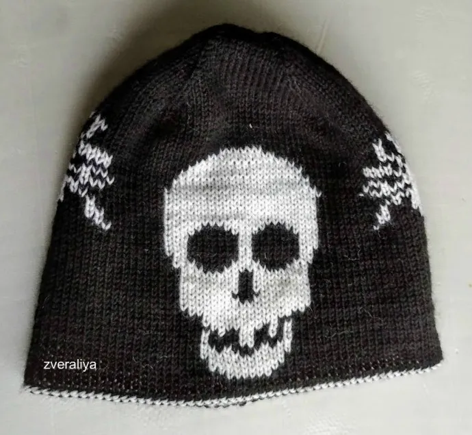 Скоро Хэллоуин. Недавно внучка моя поведала мне об изменении своих цветовых вкусов: раньше ей нравились цвета: розовый, голубой, зеленый, а теперь она предпочитает черно-белую гамму. Начала я с шапочки. Долго искала подходящий рисунок. Из того, что нашла, выбрала череп и паучков. Сваяла схему и связала вот такую шапочку: