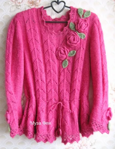 Костюм связан спицами в две нити: турецкая пряжа Alize angora gold simli с люрексом, 500м/100г и тонкий мохер Камтекс. Розы, листики, пояс-шнурок и обвязка сеточкой с зубчиками связаны крючком.