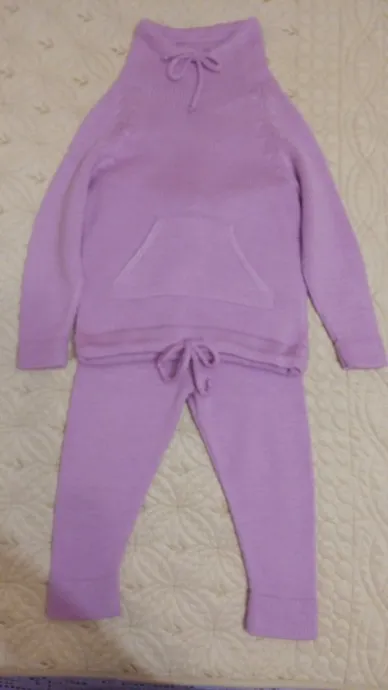 Костюмчик связан на вязальной машине из Пехорской пряжи "Детский каприз" (50% мериносовая шерсть, 50% фибра; 50гр/225м; цвет 29 розовая сирень) на плотности "7". Манжеты и кулиски на плотности "6". Шнурочки также связаны на машине на плотности "3".