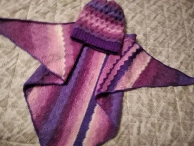 Связалась шапочка для внучки и бактус на однофонтурной машине. Обвязка бактуса крючком столбиком без накида. Нужно добавить помпон.