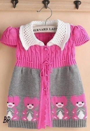 При вязании платья-сарафана использовалась пряжа трех цветов: белая, розовая и серая. Платье-сарафан с кулиской по линии талии. Верх платья-сарафана связано узором "косы". Рукава у платья короткие. Воротник вяжется отдельно из белой пряжи и пришивается позже. Низ юбочки платья украшает узор из вязаных мишек. Чтобы ваши дети носили одежду с удовольствием старайтесь вязать её из мягкой пряжи ярких цветов, чаше используйте аппликации и веселые схемы животных или мультипликационных героев. Далее - схема вязания мишек для детского платья-сарафана.