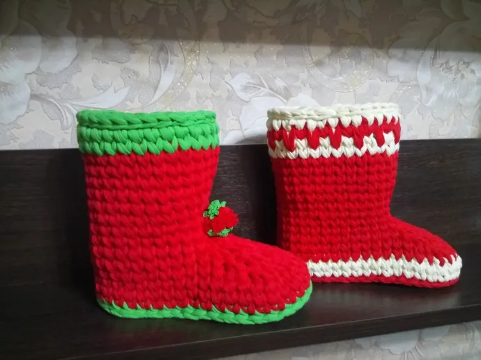Сани Деда Мороза, сапожок из трикотажной пряжи. У саней дно из фанеры.
