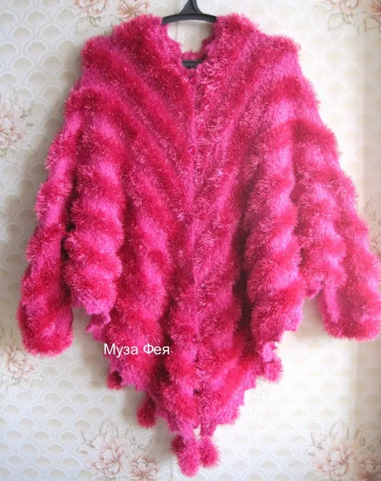 Пончо связано на спицах из травки с люрексом и п/ш букле. Начало сверху, одной деталью. Длина пончо от плеча до низа по центру - 78см. Набрать 80п. по окружности шеи, разделить на 4 части по 20п.. Если с застежкой, то разделить переднюю часть пополам. Прибавить 4 (5) петель на центральные петли, вдоль которых (до центральной петли и после нее) делать прибавки на каждом лицевом ряду. В изнаночных рядах накид провязывать скрещенной петлей.