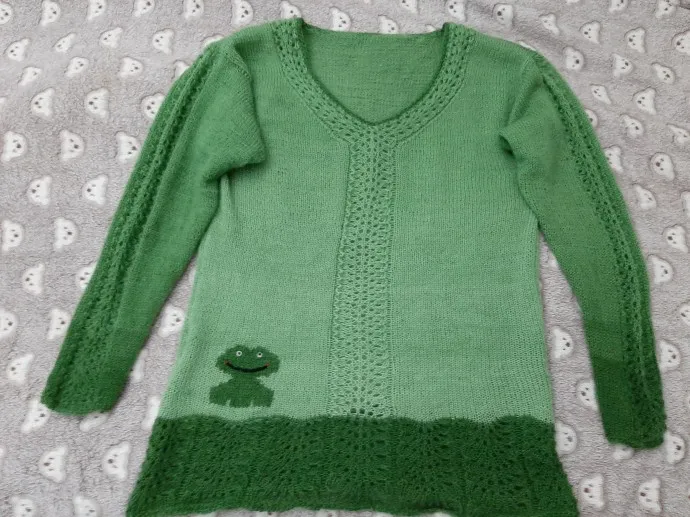 Свитерок отличный? А почему с лягушкой )), есть какая -то причина? Типа царевна — лягушка ))