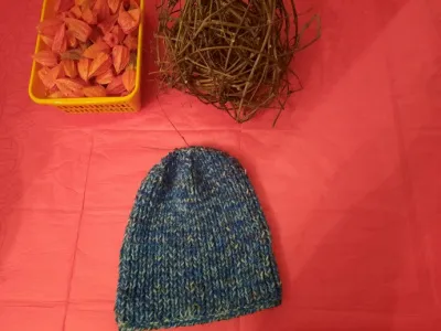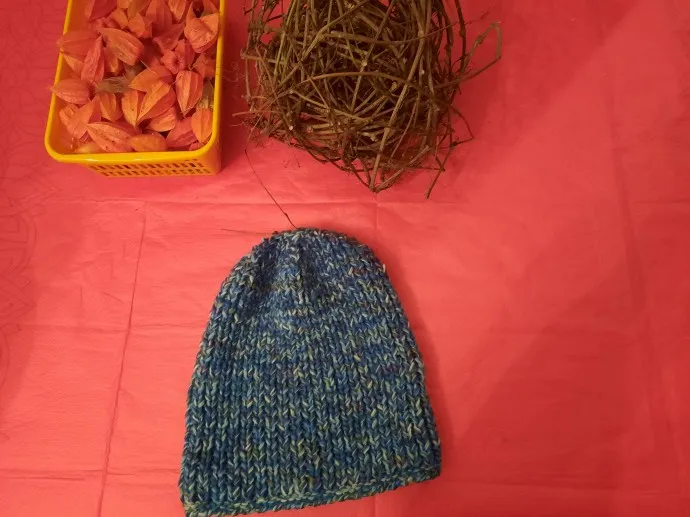 Вес шапочки составил приблизительно граммов 200, а может и меньше. Просто связала прямоугольник резинкой 1 на 1, потом разделила условно на 4 части петли, убавляла в каждом ряду в начале и конце каждой части, потом оставшиеся 6 петель стянула, далее по изнанке крючком собрала конструкцию соединительными столбиками и обвязала по низу рачьим шагом для небольшого стягивания.