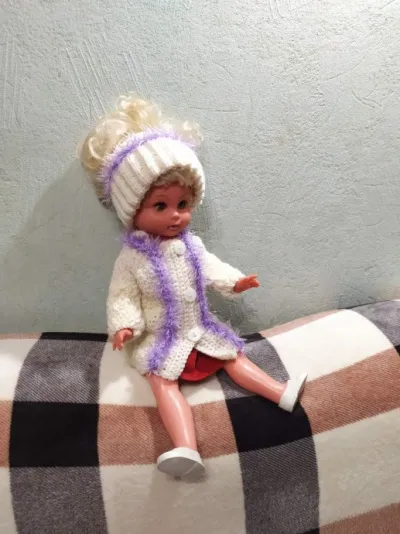 Продолжила вязание для куклы Стефани. У меня так: неделю рисую по урокам, это у меня новое увлечение. А вот эта неделя отведена на вязание. Связала пальто и шапочку. Нитки остатки, мне кажется Ализе и травка..