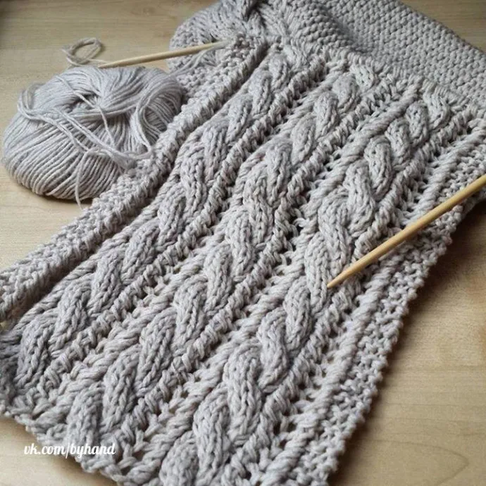 4 петли ажур (1-й ряд: 2 лиц, 1 накид, 2 лиц вместе с наклоном влево (протяжка), вязать до конца ряда, 2-й ряд – 2 изн, 1 накид, 2 изн вместе, вязать до конца ряда), 6 петель косы (коса 3х3, перекрест направо в каждом 6-м ряду) Вязать, пока шарф не достигнет длины 110-120 см, затем сшить концы, провести ВТО.