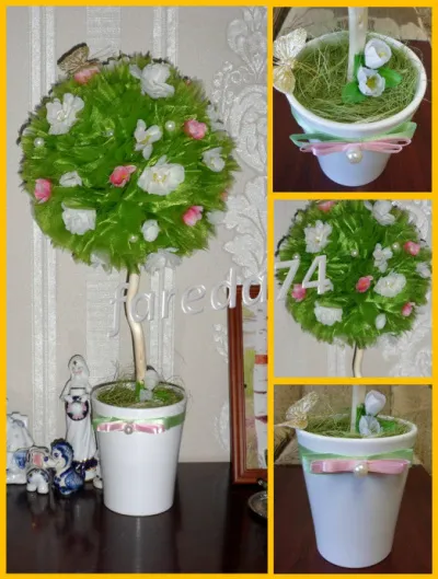 Весенний топиарий. Выполнен из цветочной органзы и искусственных цветов. Украшение бисер, атласные ленты, сизаль.
