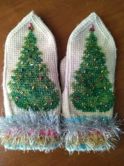Одно время увлекалась изготовлением вышитых варежек. Есть несколько фото. Тунисское вязание очень легко вышивать, так ка оно похоже на канву - в клеточку, оно более плотное, чем обычная вязка и хорошо держит элементы декора.Вязала две половинки тунисским крючком, вышивала, сшивала, привязывала резинку, как обычно на 4 спицах.