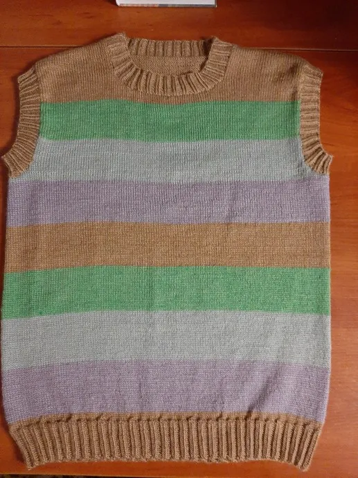 Безрукавка для мужа, связана из Троицкой пряжи "Алиса", 50% шерсть и 50% вискоза, спицами размера 3. Без особых изысков, просто лицевое полотно круговыми рядами до пройм, дальше разделила на спинку и перед, довязывала раздельно.