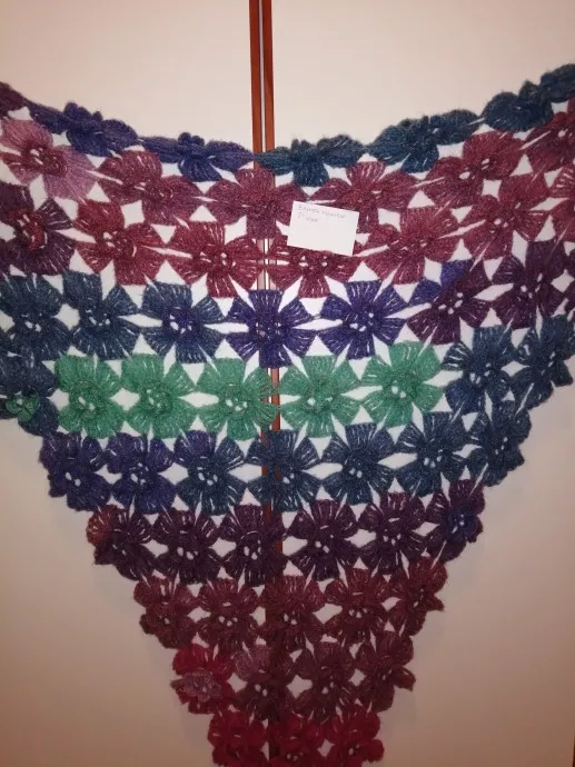 Пряжа Pashmina от Mondial (15% меринос, 10% мохер, 75% микрофибра РС), в 200 гр 1100 м. Крючок н. 4, ушло 185 гр. Шаль имеет форму равностороннего треугольника со сторонами 150 см. Очень удобно, тк не надо искать, где верх, где низ. Всего 78 цветочных мотивов, пряжа удобная и приятная в работе, вяжется не быстро, но оно того стоит.