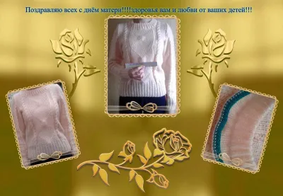 Давно заглядывалась на этот свитерок.Но думала .что я его не осилю.Выиграла пряжу на одном из сайтов и решила:свитеру имеет место быть.Начала в воскресенье вечером.а закончила в четверг.но долго что то с горловинкой мудрила Но вчера всё -таки закончила работу.Сегодня приехали внучки с дочками поздравлять.а я и внучкам подарки сделала