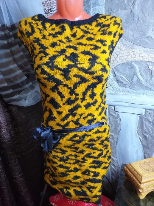 Делюсь с Вами еще одной своей работой. Платье "Тигрица" связано спицами и украшено пайетками и бисером. Вязала без всяких схем, импровизировала по ходу вязки.