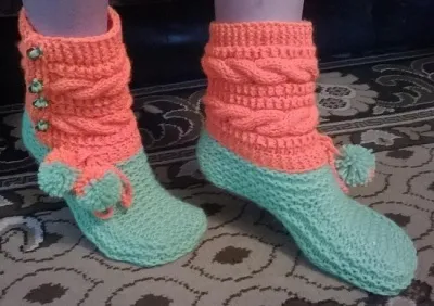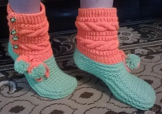 Вяжем на нужную Вам длину, в последнем ряду убавляем 6 петель, вяжем 5рядов платочной вязкой, закрываем сшиваем, накладываем наверх тапочка, примерно2 см, и пришиваем свободно. Вот и все.