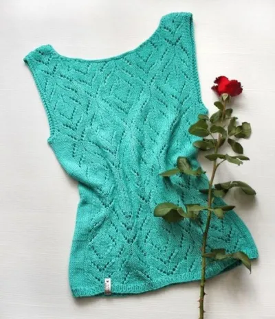 Топ связан из Nako calico(50% хлопка,50%премиум акрил) 245м в 50граммах, цвет №10873..На 46размер ушло 2,5мотка. Использовала спицы №4 для основного вязания и№3,5 на резинку. Плотность 20 петель в 10см. На спицы №3'5 набрала 180петель.После резинке разделила на перед и спинку. Перед 5раппортов узора, схему нашла на страничке @trinity_wool ), чередовала один раппорт с 1 ряда,2 с 25ряда и т.д. До выреза на спинке 36см, до пройм 40см, до выреза горловины 54см.