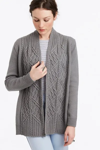 Пришить воротник вдоль выреза горловины спинки. Вшить рукава. Выполнить боковые швы и швы рукавов. Отпарить швы кардигана с аранами.