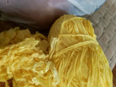 Как- то задарили мне пряжу,со словами:-" ну может что- нибудь и придумаешь!" Лет десять как.... Временами перебираю свои сокровища- спотыкаюсь об этот шедевр прядильного искусства, со вздохом прячу.