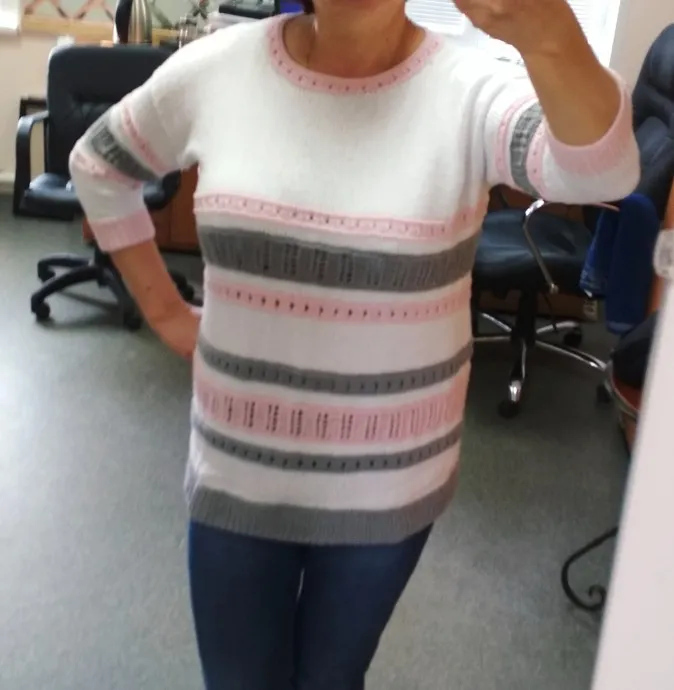 Джемпер полосатый из пряжи Джинс связала из остатков от детских изделий, докупив белого цвета. В носке нравится, очень приятный к телу. Единственный минус вытягивается изделие при носке.