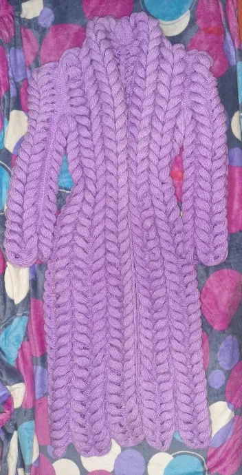 Полу шерсть, спицы 4,5. Не судите строго, это моя первая работа. Не считая носков))) Все ваши поправки приму к сведению.