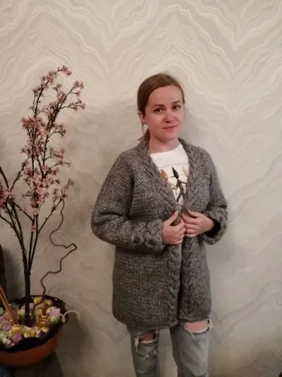 Этот кардиган тоже вязала по фото заказчицы, очень теплый получился из пряжи Alize Lanagold Maxi 100гр/100м спицы №4, узор путанка и коса. Заказчица моя очень миниатюрная, на 44 размер ушло достаточно много 11 мотков.