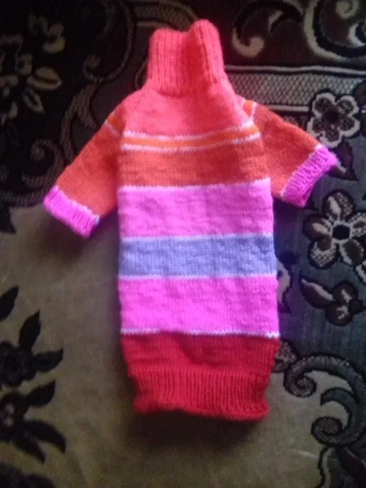 Свитера связаны из детской акриловой пряжи для маленькой собаки. Длина 30 см и окружность 30-37 см.
