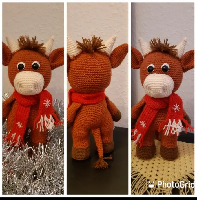 Сейчас в интернете столько идей для вязания бычков , тёлочек , что трудно удержаться от вязания такой забавной игрушки . Нитки - остатки . Здесь есть и акрил , и полиакрил и с добавкой шерсти . Главное по толщине подобрать . Остатков много . Мне не нравится комбинировать , а пришлось .... Крючок 2.5 .