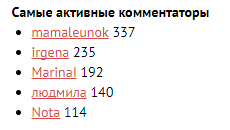 Хочется также отметить irgena, которая оставила не намного меньше - 235 комментария, MarinaI - чуть-чуть меньше - 192, людмила - 140 и Nota 114 - список лидеров может меняться и трансформироваться, но по-прежнему все в Ваших руках!