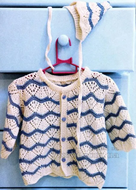 Вам потребуется: пряжа "Ольга" (50% шерсть, 50% акрил, 392 м/100 г) -100 г белого и 30 г синего цветов, спицы №2,5, крючок №2,5, 4 пуговицы.