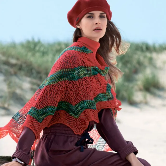 Описание работы: с контрастной вспомогательной нитью свободно набрать на спицы 2 петли нитью секционного крашения. Провязать 55 р. платочной вязкой. После 55-го р. набрать по левому краю 27 п., петли, набранные со вспомогательной нитью, перевести на левую спицу и провязать лицевыми 31 п., вспомогательную нить удалить. В следующем изнаночном ряду вязать 2 кром. лицевыми, 27 лицевых, 2 кром. лицевыми. Далее вязать сквозным узором по схеме А. Начать с 3 п. перед стрелкой а, 2 раза повторить раппорт = 1 сегмент узора между стрелками а и b, далее 1 раз провязать сегмент узора между стрелками а и с, затем 1 раз провязать средний узор без петель между стрелками с и b, затем 2 раза повторить раппорт = 1 узорный сегмент между стрелками а и b, 1 раз провязать узорный сегмент между стрелками а и с и закончить 3 п. после стрелки d. В высоту провязать 1 раз 1-92-й р. После последнего ряда схемы А на спицах лежит 213 п. Продолжить вязание по схеме В. Начать с 3 п. перед стрелкой а, 5 раз повторить раппорт = 1 сегмент узора между стрелками а и b, после чего 1 раз провязать сегмент узора между стрелками а и с, далее 1 раз выполнить средний узор между стрелками b и d, затем 5 раз повторить раппорт = 1 сегмент узора между стрелками а и b, еще 1 раз провязать сегмент узора между стрелками а и с и закончить 3 п. после стрелки d. В высоту провязать 93-140-й р. 1 раз. После последнего ряда схемы В на спицах лежит 389 п.
