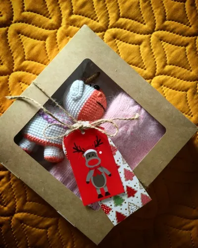 Подарок упакован для подружки. Шапочка из пуха норки и маленький бычок, символ 2021 года.