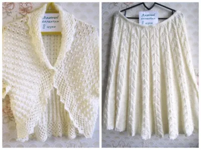 Длина юбки - 70см. Болеро - 46-48 размер. Спицы №3,5, отделка крючком №3 - низ юбки и край болеро, сеточка с зубчиками. Болеро представляет собой прямоугольник 90х 65см.